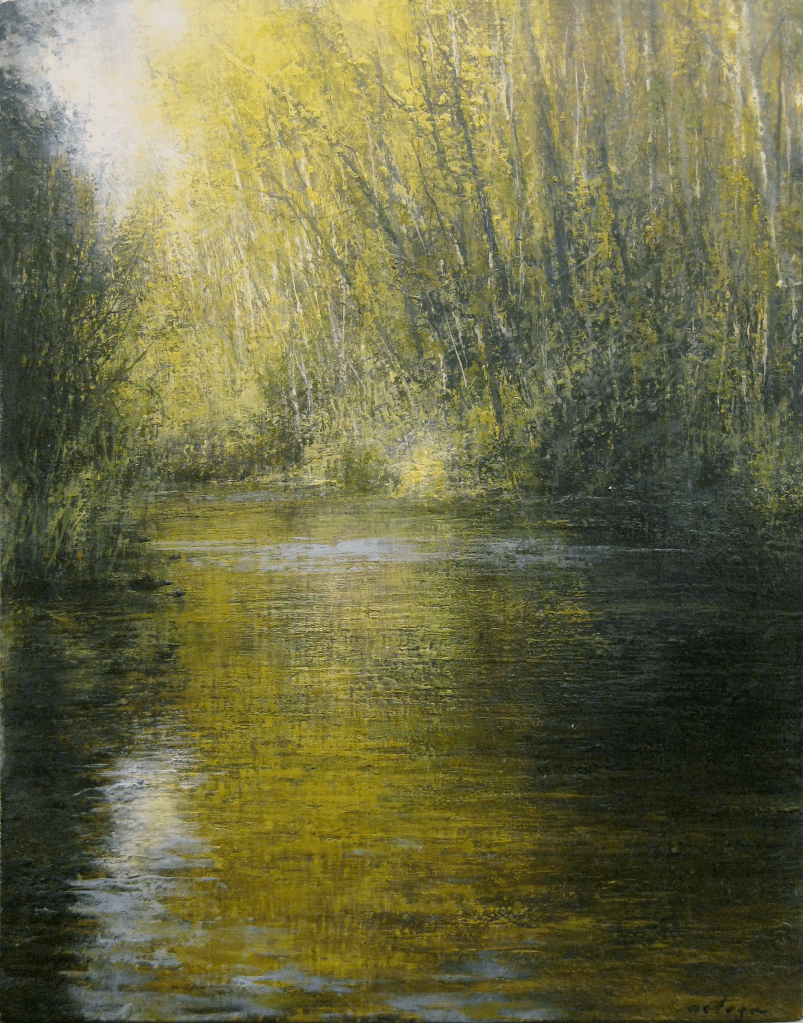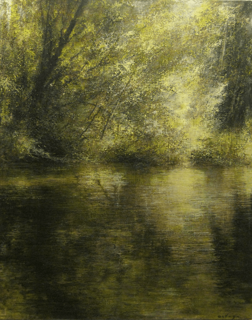 La naturaleza es una fuente inagotable de inspiración para Ortega. Los paisajes que tanto le identifican representan su personal mirada en la que da protagonismo a la luz y las texturas del momento que reproduce, un momento que no pretende ser realista sino transmitir lo que siente cuando se adentra en ellos. Quiere sorprender al espectador creando un juego de luces y sombras, una atmósfera que convierte la pintura en un paisaje vivo, trasmitiendo la emoción, el frescor, la serenidad y la paz que regala la naturaleza, incluso los silencios o los espacios que están entre los objetos pero que son etéreos.